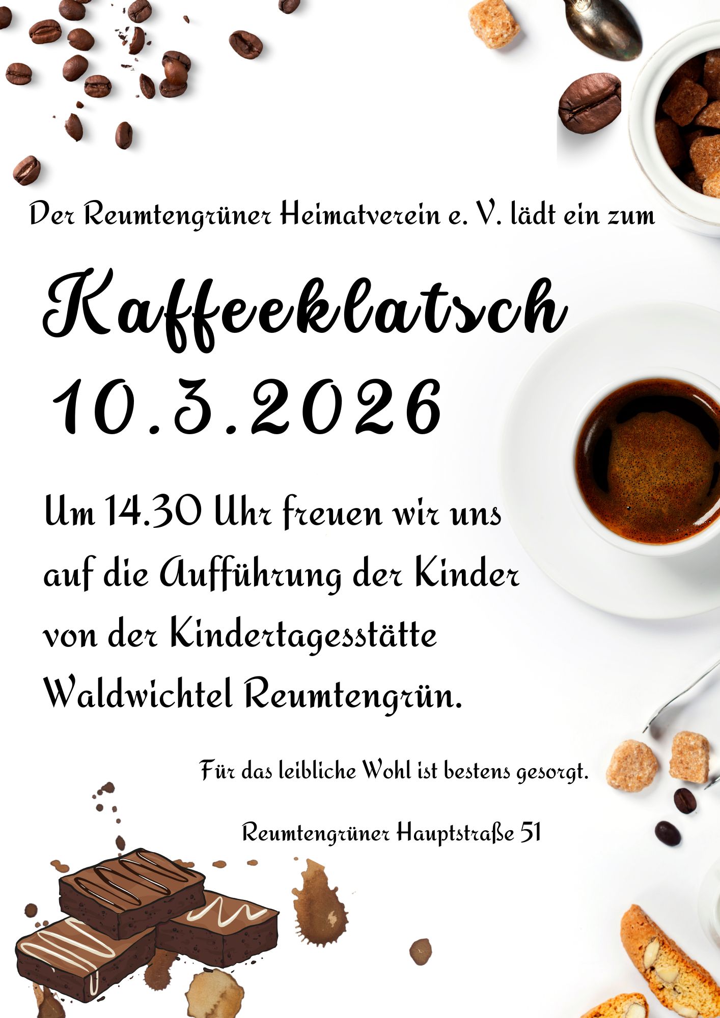 | 10. | 14:30 Uhr, Kaffeeklatsch im Heimatverein, |