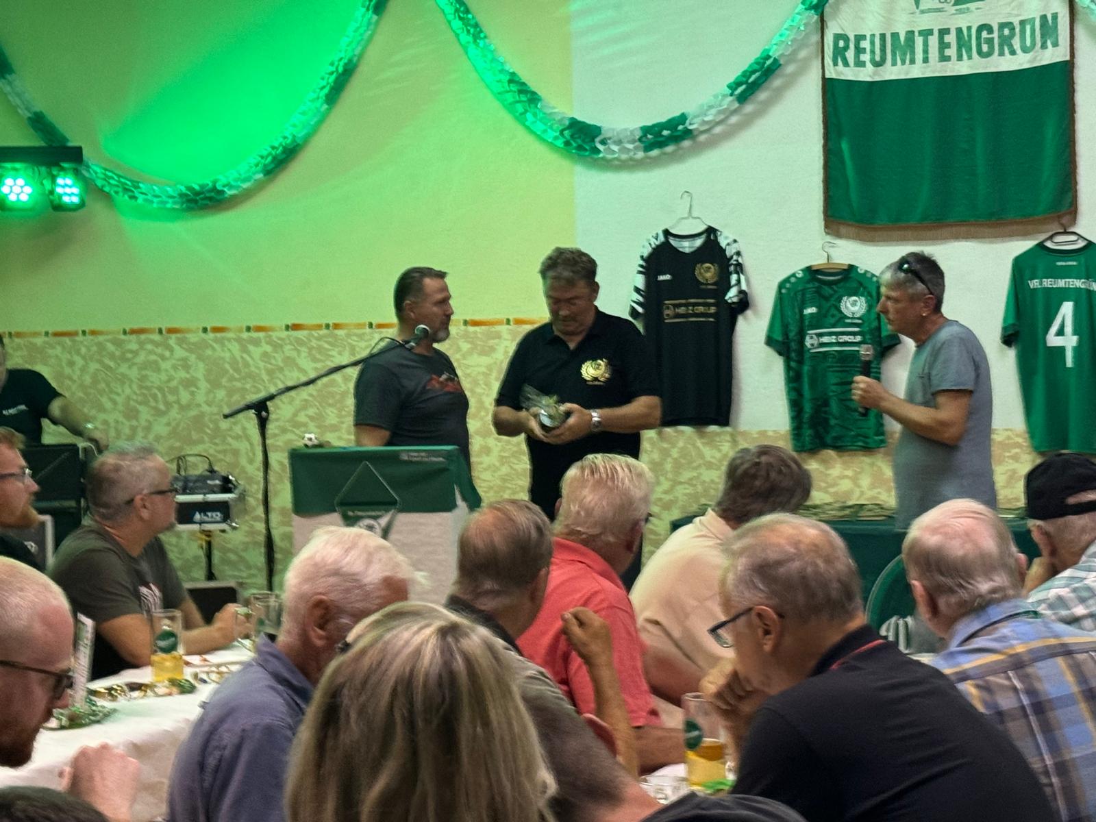 Vor 100 Jahren wurde der VfL Reumtengrün gegründet. Dies war ein würdiger Anlass, um dieses Jubiläum vom 6. - 8. September zu feiern. Die Vorbereitungen verlangten von den Beteiligten viel Zeit, Ideen und Ausdauer. Eindrucksvoll war die Ausstellung zur Historie des Vereins im Stammlokal des VfL. Der Einladung ist eine Jugendmannschaft unserer Partnergemeinde in Svoboda gefolgt. Der Freitag war neben einem Fussballspiel der Festveranstaltung vorbehalten. Nach der Begrüßung gab der Abteilungsleiter Fußball, Uwe Ebert, einen zeitlichen Überblick über viele Ereignisse in der 100jährigen Geschichte des Vereins. Der Verein hatte 1924 sein Domizil im Wald, am sogenannten Alten Feld. Nach der Wende konnte das Gebäude erweitert und ein Ausweichsportplatz geschaffen werden. Möglich war dies alles durch Sponsoren, Fördermitteln, Zuschüssen von der Stadt und dem unermüdlichen Wirken vieler ehrenamtlicher Mitglieder des Vereins. Dies war ein Grund diese "stillen Helfer " zu ehren. Von verschieden Verbänden und Vereinen wurden Glückwünsche überbracht.