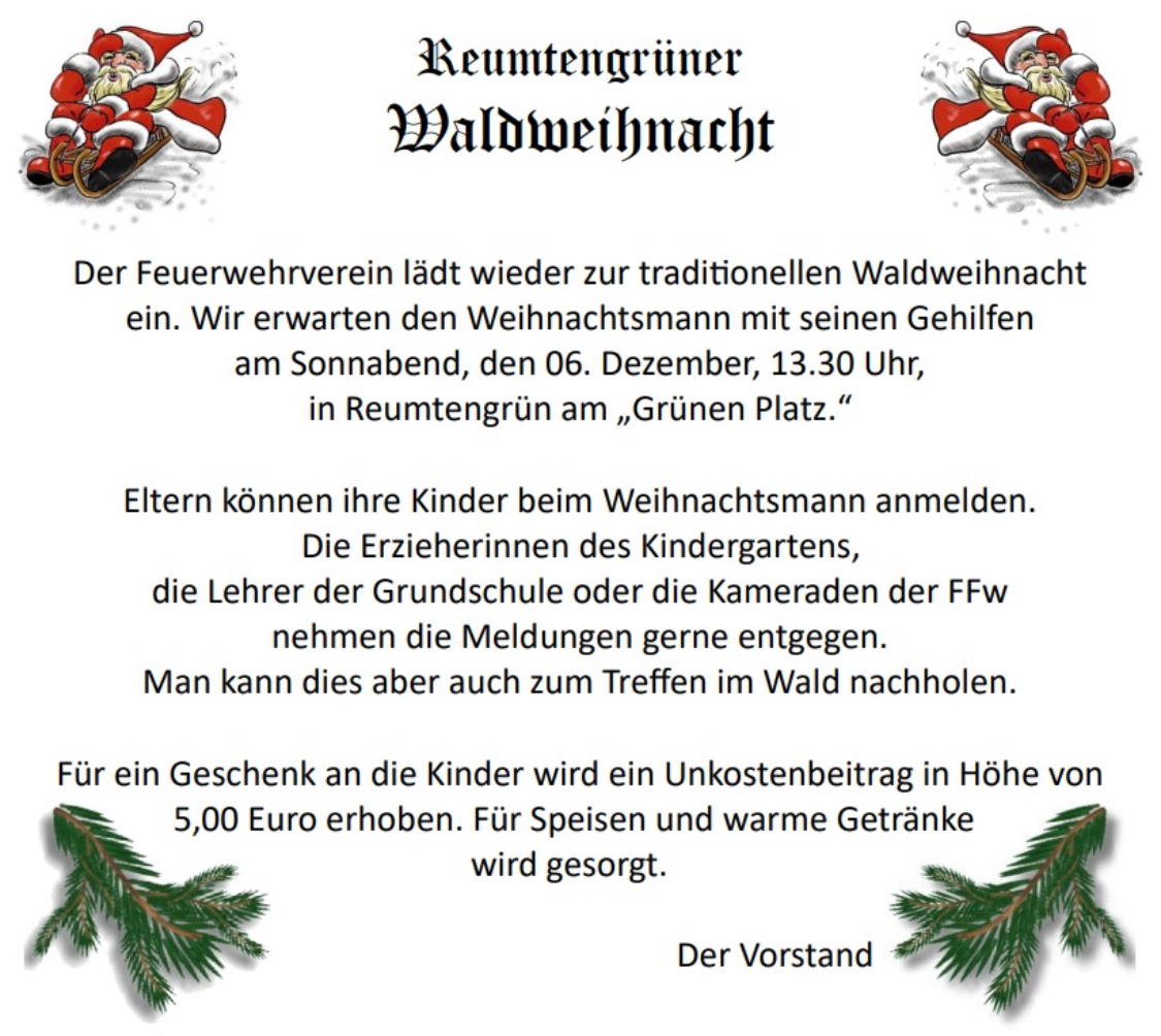 Am 1. Dezember öffnete eine Schülerin der Reumtengrüner Grundschule das 1. Türchen am Adventskalender. Diesem Ereignis wohnten die Kinder des Kindergartens und der Schule bei. Der Ortsvorsteher hielt eine kleine Ansprache und die Kinder sangen gemeinsam ein Weihnachtslied.
